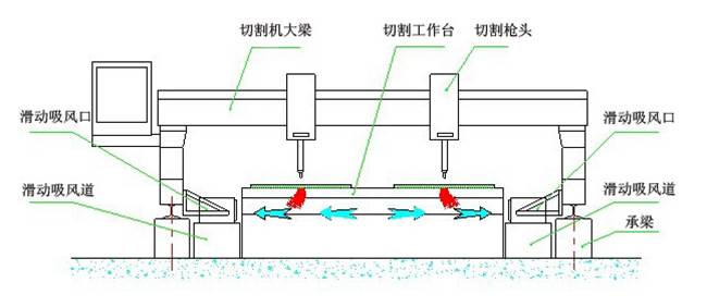 側吸式煙塵凈化系統采用吸風口固定在切割機龍門架上,吸風口與吸風道之間通過密封皮帶密封,吸風口可隨龍門架在吸風道上來回移動吸風,將切割的粉塵吸除。
