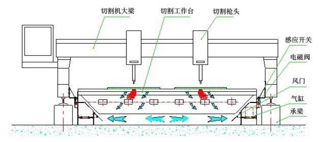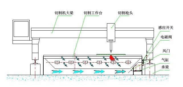 下吸式煙塵凈化系統抽風是通過下吸式抽風切割臺來實現的,下吸式抽風切割臺分成若干個區域,每個區域設計有風門吸風,切割槍頭在每個區域切割時,相應區域的風門打開抽風,將切割機的粉塵吸除。